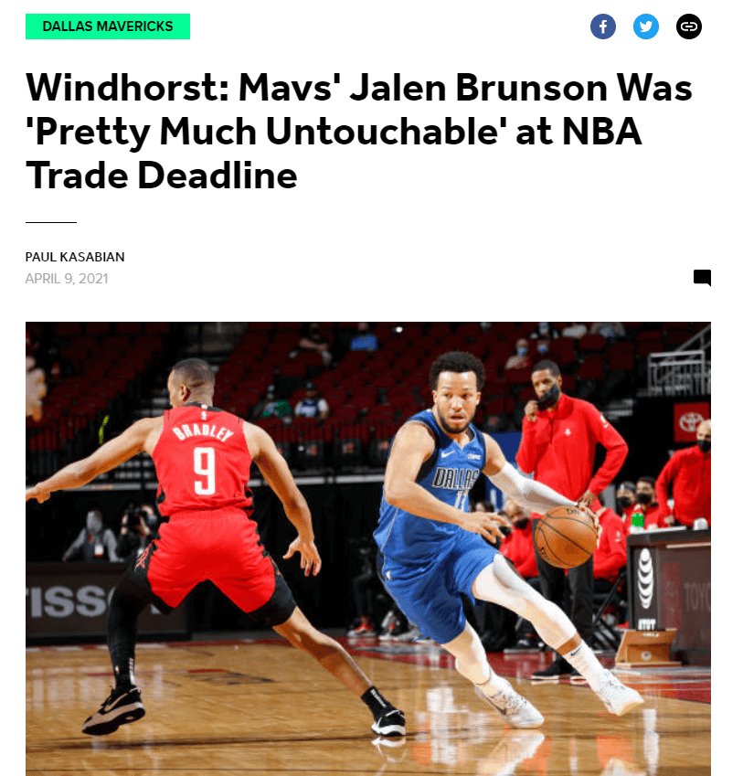 在节目当中,Brian Windhorst在节目中谈到了达拉斯独行侠队的后卫布伦森,Brian Windhorst表示虽然东契奇毫无疑问是独行侠队的非卖品,但布伦森同样被球队视为未来的基础核心球员,几乎是不可被交易的,值得一提的是,Brian Windhorst声称独行侠管理层对于其他球队对布伦森的问价态度十分强硬,甚至表示“如果你出价勒布朗(詹姆斯),那独行侠会听电话的。”