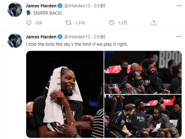 来源:JRS低调看直播04-09 11:48JRS低调看直播4月9日讯 篮网巨星詹姆斯-哈登更新动态,晒出三张合影并且发推写道:我告诉兄弟们,如果我们打得好的话,天空才是我们的极限;哈登还专门发推写道:高呼杜兰特回来了!(SNIPER狙击手是杜兰特的绰号);篮网官方转发哈登的动态。