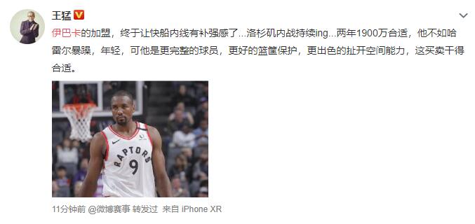 伊巴卡加盟后,王猛也第一时间分析了这笔交易:伊巴卡的加盟,终于让快船内线有补强感了...洛杉矶内战持续ing...两年1900万合适,他不如哈雷尔暴躁,年轻,可他是更完整的球员,更好的篮筐保护,更出色的扯开空间能力,这买卖干得合适。