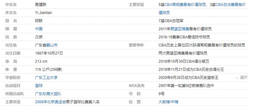 此外,易建联还是CBA历史总得分王、历史总篮板王、历史总两双王、常规赛得分王、常规赛篮板王、常规赛两双王以及季后赛盖帽王。