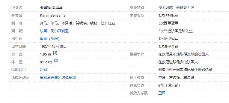 卡里姆-本泽马(Karim Benzema),1987年12月19日出生于法国里昂,法国足球运动员,场上司职前锋(中锋),效力于西甲皇家马德里足球俱乐部个人简介: