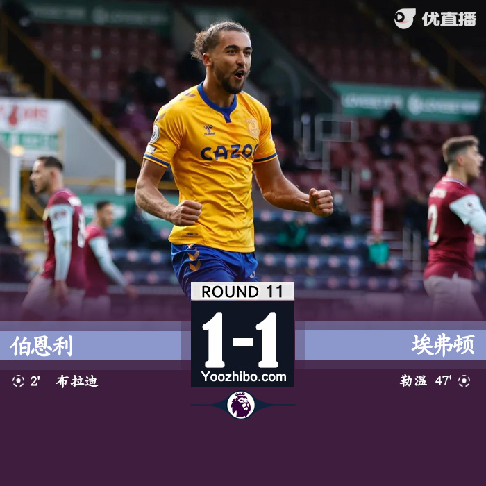 JRS低调看直播讯:北京时间12月5日晚20:30,英超第11轮比赛打响,埃弗顿客场挑战伯恩利。上半场,布拉迪远射首开记录,理查利森助攻勒温扳平;下半场,双方互有攻守,比分没有发生变化。最终,埃弗顿客场1-1战平伯恩利,两支球队均连续两轮不胜。