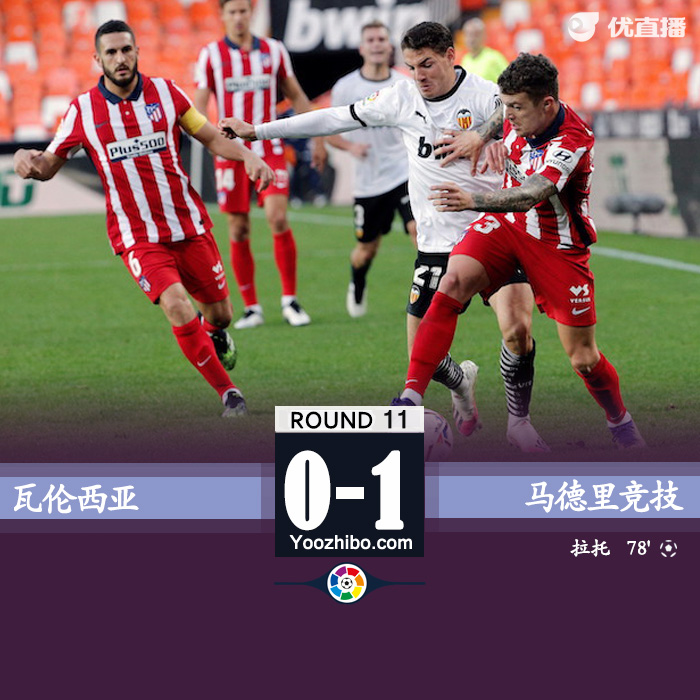 JRS低调看直播讯:北京时间11月28日23:15分进行西甲联赛第11轮,瓦伦西亚主场对阵马德里竞技。上半场比赛,勒马尔两脚高质量射门都被多梅内克飞身扑出,奥布拉克扑出拉契奇近距离的推射以及勒马尔的解围。下半场比赛,卡拉斯科传中造成拉托乌龙。全场比赛结束,马竞1-0战胜瓦伦西亚,取得联赛六连胜,少赛一轮的情况下23分追平联赛头名皇家社会,排名联赛第2。