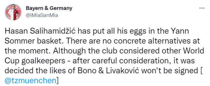 该媒体表示,萨利哈米季奇已经把所有鸡蛋都放在了索默这一个篮子里,拜仁的目标只有索默一个人,没有其他的B计划。