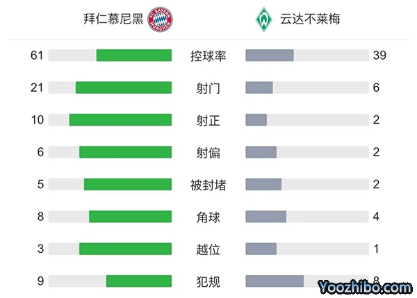 全场比赛结束,拜仁6-1大胜不莱梅。
