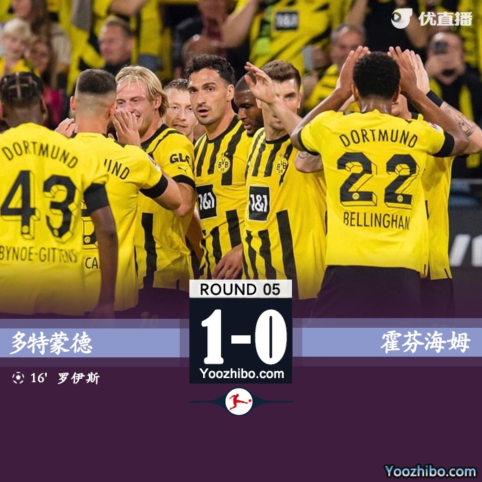 全场比赛结束,最终多特蒙德1-0击败霍芬海姆。