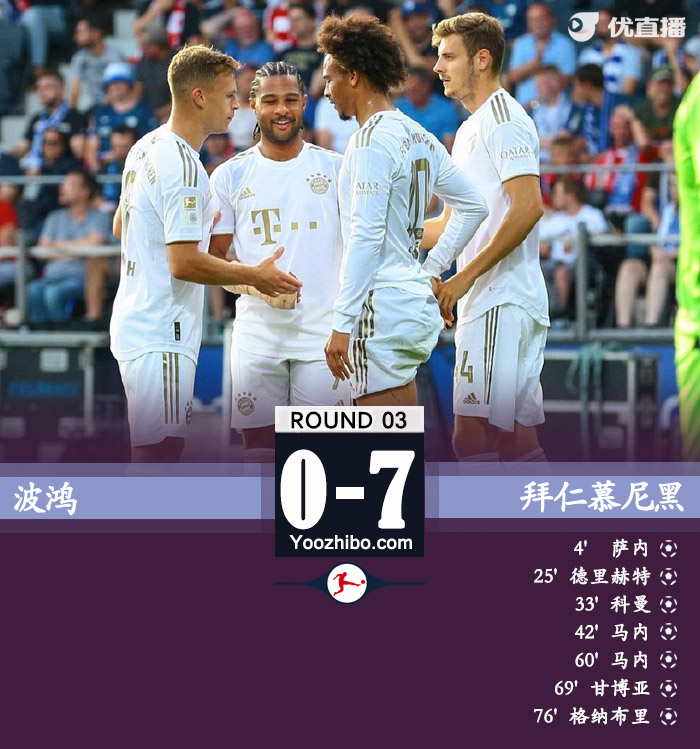 来源:JRS低调看直播08-22 02:02 JRS低调看直播讯:北京时间8月21日23:30,德甲第3轮展开较量,波鸿主场对阵拜仁。上半场刚开场科曼将球回做,萨内劲射破门,之后德利赫特头球破门,随后波鸿后卫出现失误,科曼门前补射将球打进,马内破门被吹手球,一分钟后马内杀入禁区晃过后卫左脚低射破门。下半场科曼造点,马内点射破门,随后甘博亚自摆乌龙,之后格纳布里小角度打门,皮球击中立柱弹入球网。全场结束,波鸿0-7不敌拜仁。