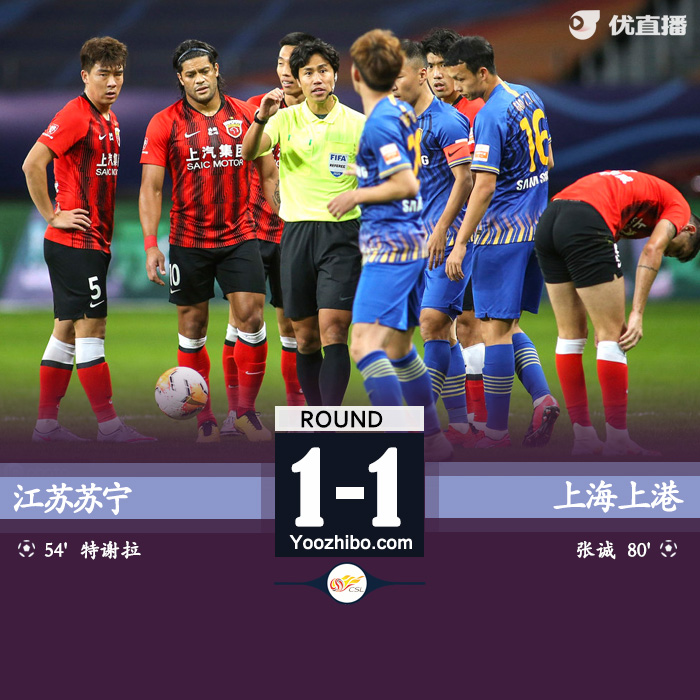 JRS低调看直播讯:北京时间10月29日晚19点35分,2020年中超联赛第二阶段第三轮(总第17轮)争冠组江苏苏宁和上海上港的比赛,在苏州奥林匹克中心开始。上半场江苏苏宁制造更多威胁场面,但没有进球。下半场第54分钟埃德尔右路送出精准直塞球,特谢拉反越位得手,禁区内挑射得分。第68分钟买提江铲球踢在张诚脚腕下,结果吃到红牌被罚下。第81分钟奥斯卡外围送球,王燊超拿球在禁区右侧传中,吕文君倒地卧射打疵,但球弹起砸在张诚脸上反弹进门。最终两队1比1踢平。