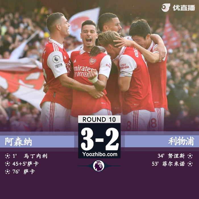JRS低调看直播讯北京时间10月9日23点30分,英超第10轮焦点战阿森纳主场对阵利物浦。上半场开场1分钟马丁内利闪击破门,努涅斯铲射扳平比分,迪亚斯伤退,萨卡补时阶段打进一球。下半场,厄德高错失良机,菲尔米诺再度扳平比分,热苏斯造点,萨卡点射破门,全场比赛结束,阿森纳3-2利物浦。