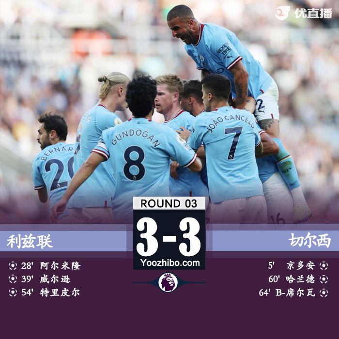 JRS低调看直播讯北京时间8月21日23点30分,英超第3轮曼城客场挑战纽卡斯尔。上半场,京多安闪击破门,曼城攻势占优,波普多次贡献扑救,阿克伤退,圣马连续助攻阿尔米隆和威尔逊完成反超。下半场,哈兰德中柱,特里皮尔任意球破门,哈兰德和B席先后进球将比分扳平,全场比赛结束,曼城3-3纽卡斯尔。