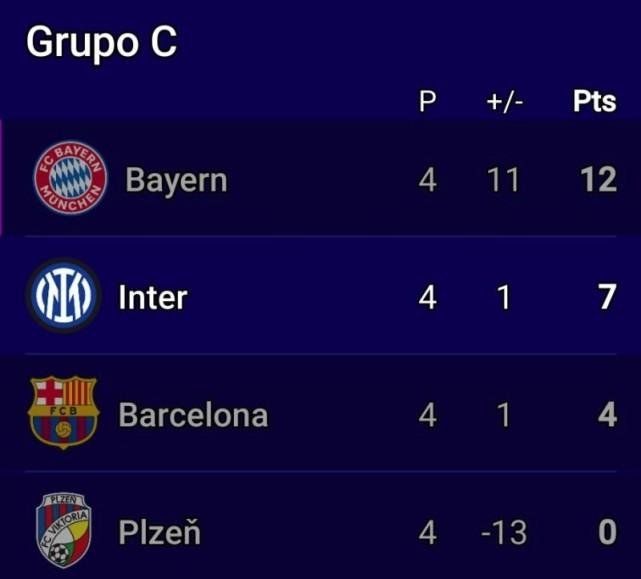 在本轮比赛后,拜仁4连胜积12分,国际米兰2胜1平1负积7分,巴塞罗那1胜1平2负积4分,比尔森胜利则是0分垫底。其中,拜仁慕尼黑已经提前两轮欧冠小组出线。巴萨将与国米就该小组另外一个出线名额展开角逐。在相互战绩方面,国米2回合1胜1平战绩占优。