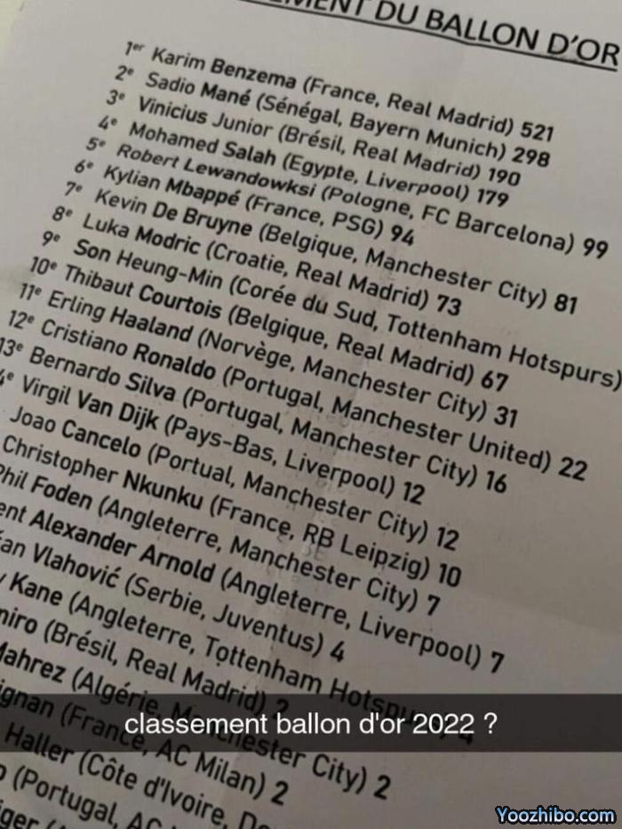 网传2022金球奖排名:本泽马第一,马内第二