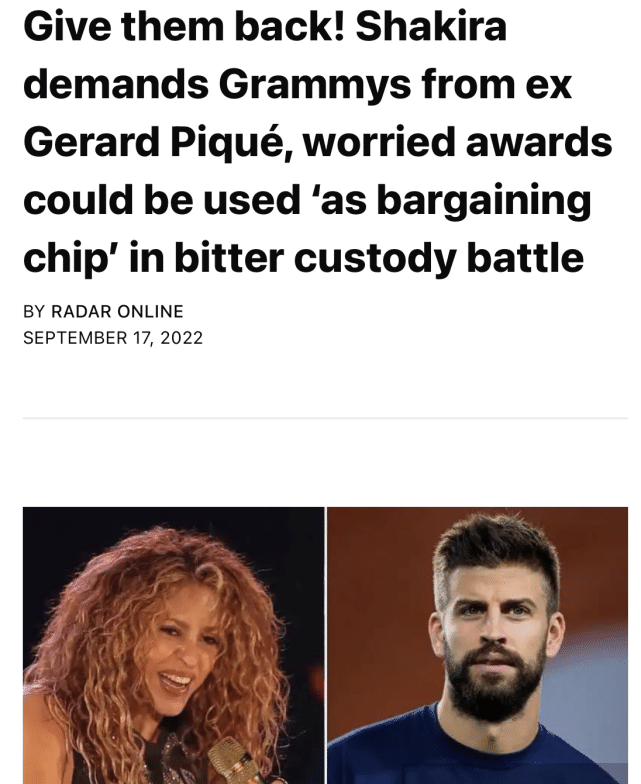 皮克拒还夏奇拉15座格莱美奖杯!要挟大10岁的夏姐:拿2子抚养权换