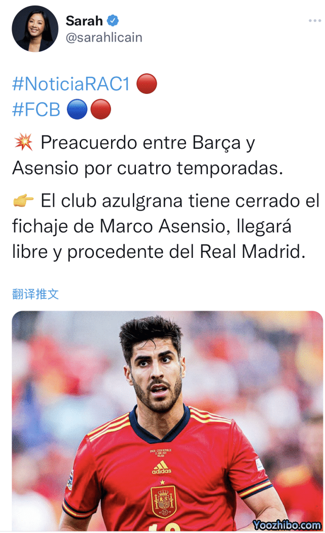 来源:JRS低调看直播09-26 18:31JRS低调看直播09月26日晚,西班牙知名媒体RCA1记者Sarah Li Cain扔出了一则重量级消息,效力于皇马的26岁“王储”阿森西奥已经与巴萨完成了签约。双方签下了一份为期4个赛季的预先协议。由于与皇马的合同只剩1年,阿森西奥将在明夏以自由球员的身份加盟死敌。