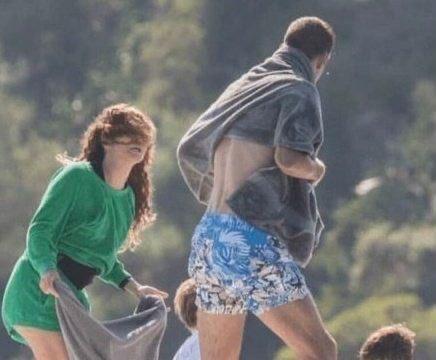 夏奇拉穿着一套绿色连体裙,而皮克则是赤膊上身穿着一条碎花泳裤。两人都拿着灰色的浴巾,不知何故就发生了争吵,甚至全然不顾两个年幼的儿子就在身旁。气愤咆哮的夏奇拉长发在风中凌乱,用手怒指皮克。而皮克也丝毫没有当初对夏奇拉的温柔体贴,而是选择怒目回击。