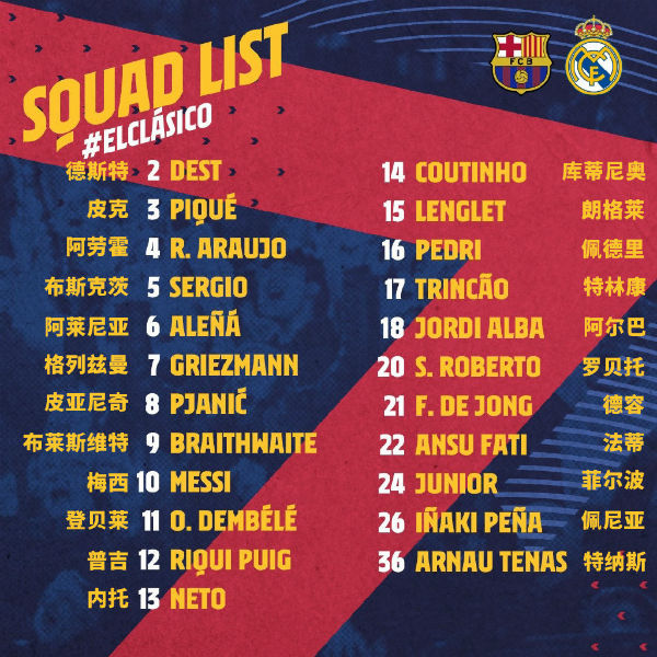 巴萨公布对阵皇马德比大名单:梅西格子领衔,阿尔巴复出