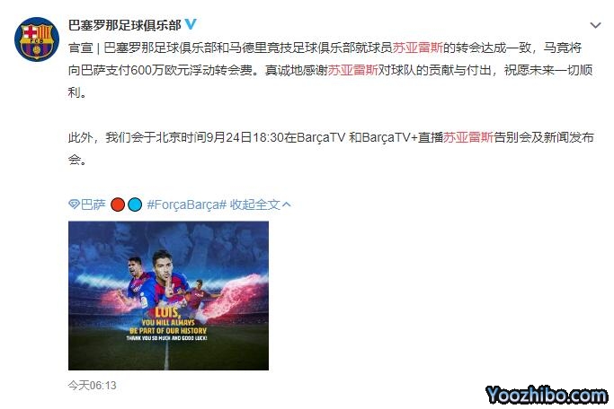 9月24日JRS低调看直播讯,巴萨官方发布公告,俱乐部就苏亚雷斯的转会已经与马竞达成一致,马竞无需支付转会费但交易包含600万欧的浮动奖金条款,据悉苏亚雷斯与马竞签下的是2年合约。
