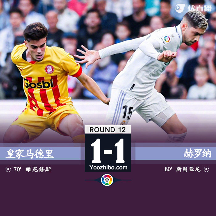 JRS低调看直播讯北京时间10月30日23点15分,西甲第12轮皇家马德里主场对阵赫罗纳。上半场,罗德里戈射中立柱,埃雷拉爆射回敬一脚门框。下半场,维尼修斯破门,阿森西奥送点,斯图尼亚点射扳平,罗德里戈进球被吹,克罗斯两黄变一红被罚下。全场比赛结束,皇家马德里1-1赫罗纳。
