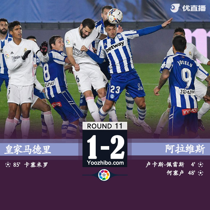 JRS低调看直播讯:北京时间11月29日04:00(西班牙当地时间28日21:00),2020/21赛季西甲第11轮一场焦点战在迪斯蒂法诺球场展开争夺,皇家马德里主场1比2不敌阿拉维斯,卢卡斯-佩雷斯射入点球,何塞卢抓住库尔图瓦失误破门,卡塞米罗扳回一城。阿扎尔伤退,皇马连续3轮不胜。