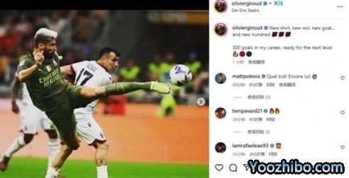吉鲁在比赛第58分钟接莱奥挑传,飞身凌空侧钩破门。数据统计显示,吉鲁也就此解锁了个人生涯的300球里程碑。