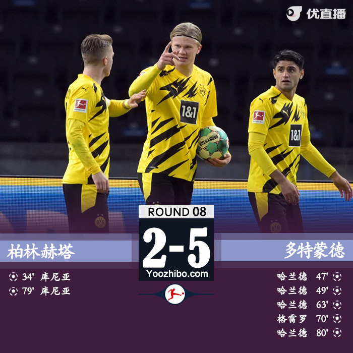 JRS低调看直播讯:北京时间11月22日凌晨03:30,德甲联赛第8轮,多特蒙德客场挑战柏林赫塔。上半场比赛,库尼亚远射破门。下半场比赛,哈兰德15分钟内上演帽子戏法,格雷罗捅射破门,古恩多齐造点库尼亚进球,哈兰德推射破门完成大四喜,穆科科替补登场完成首秀。最终全场比赛结束,多特蒙德客场5-2逆转战胜柏林赫塔。