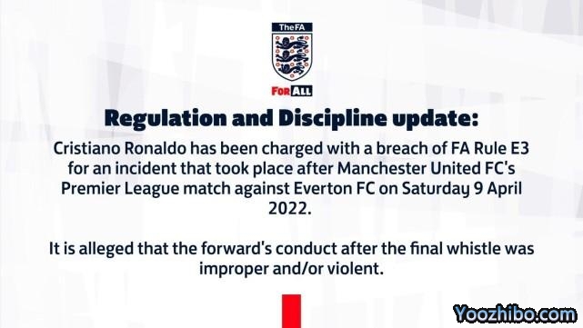 英足总声明中写道:“C罗因在2022年4月9日曼联与埃弗顿的英超联赛比赛后,发生的一起事件而被指控违反了英足总E3规则。据称这名前锋在终场哨响后的行为,是不当和/或暴力的。”
