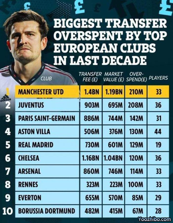 来源:JRS低调看直播09-21 16:13JRS低调看直播09月21日曼联在转会市场上的引援水平一直备受嘲讽,数据也证实了这些批评并非毫无道理。「CIES足球瞭望台」最近公布的一项调查结果显示,2012年至今的10年转会中,曼联引进33名球员,实际花费的转会费比估值高出近2.4亿欧元!这在欧洲五大联赛(英超、西甲、德甲、意甲和法甲)中排名第一,就是买人的头号「冤大头」。