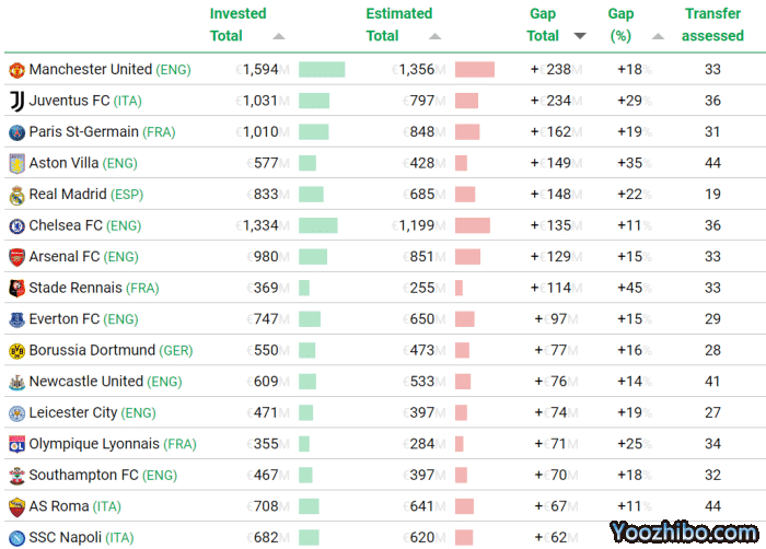 十年来,曼联引进33名新援总共花费15.94亿欧元,他们的估值为13.56亿欧元,也就是说曼联多花了2.38亿欧元,溢价幅度18%。