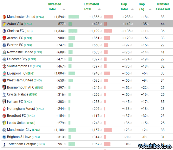 数据显示,仅有两家英超俱乐部的买人价格低于预估值,他们分别是布莱顿(-100万欧元)和热刺(-600万欧元)。