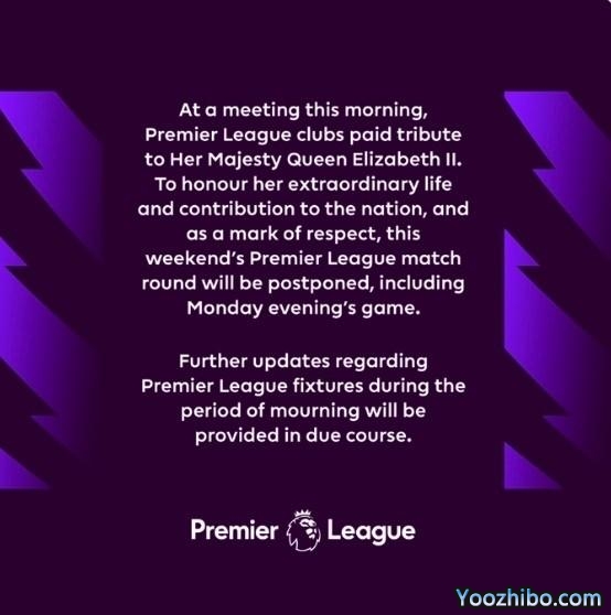 来源:JRS低调看直播09-09 21:59JRS低调看直播09月09日讯 晚,英超联盟官方发布消息,尽管政府准许本周末进行比赛,但英超方面仍然决定推迟比赛。延期的决定,为了纪念女王陛下不平凡的一生和对国家的贡献,也为了表示尊重。