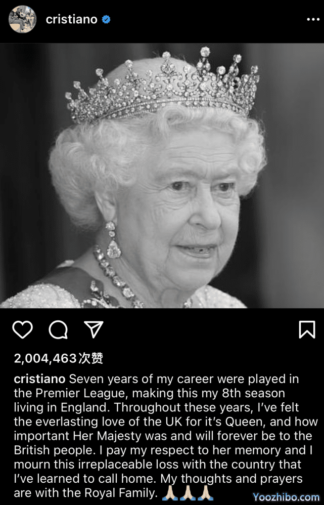 C罗发文悼念女王:深切感受对她的爱,我心与王室同在!200万人点赞