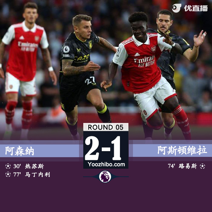 来源:JRS低调看直播09-01 10:09 JRS低调看直播讯:北京时间9月1日2点30分,英超第5轮一场焦点战在酋长球场进行,由领头羊阿森纳坐阵主场对战来访的阿斯顿维拉,本场比赛的主裁是罗伯特·琼斯。上半场节奏很快,开场维拉率先在反击中制造威胁,布恩迪亚禁区中路射门高出。随后阿森纳连续发动猛攻,热苏斯和加布里埃尔先后威胁维拉大门,萨卡面对空门离谱踢飞。终于热苏斯在一次进攻中补射破门打破僵局。下半场厄德高任意球被扑出,路易斯角球直接破门扳平比分。随后萨卡助攻马丁内利迅速反超。最终阿森纳2-1战胜阿斯顿维拉,新赛季开局取得五连胜,继续领跑英超。