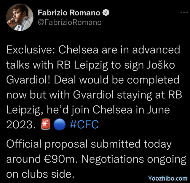 来源:JRS低调看直播08-31 20:23JRS低调看直播08月31日讯 凌晨,来自意大利天空体育著名记者Fabrizio Romano的独家报道,切尔西正在就克罗地亚国脚中卫格瓦迪奥尔的交易,和莱比锡红牛队进行深入谈判。