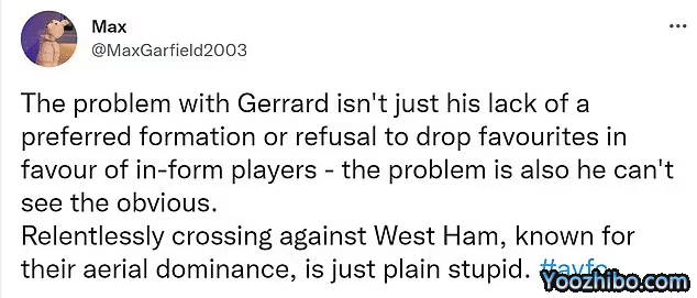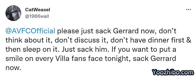 维拉球迷写道:“我要把这句话喊到我面红耳赤:杰拉德现在对于执教就是力不从心。直到他离开,维拉的情况才会改变。”;“赶紧先让他下课。如果你今晚想让每一个维拉球迷微笑,现在就解雇杰拉德。杰拉德这人很傲慢,认为一切都是为了他自己。我敢肯定他把更衣室弄得很乱,我在维拉身上看不到任何团结的迹象了。”