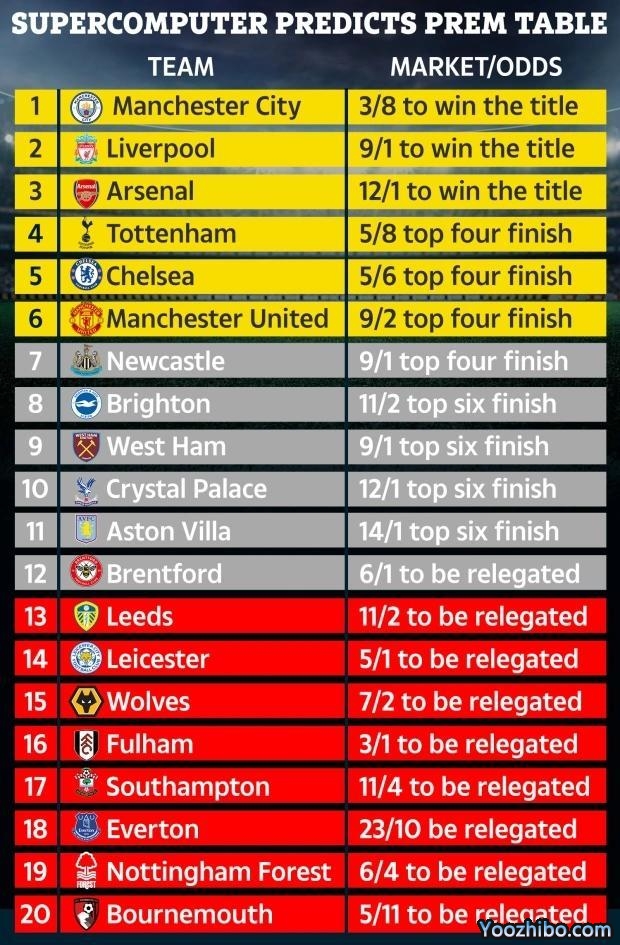 超级计算机预测本赛季英超排名如下: