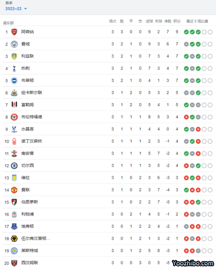 阿森纳现在9分排名第一,曼城7分排名第二,利兹联7分第三,热刺7分第四,切尔西4分第12。
