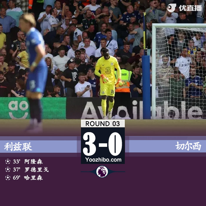 全场比赛结束,切尔西0-3不敌利兹联。