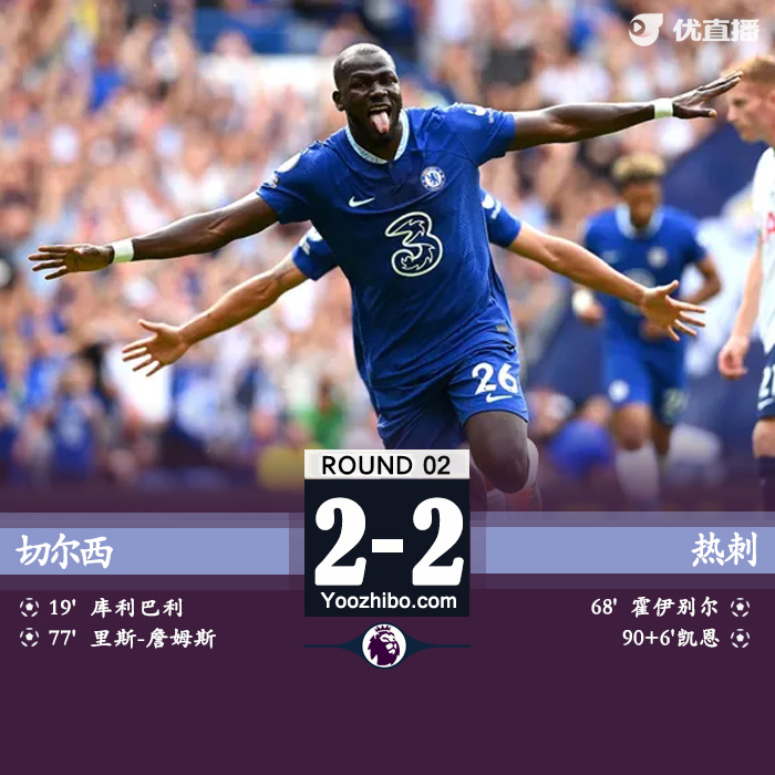 切尔西2-2热刺 库利巴利处子球 凯恩补时绝平