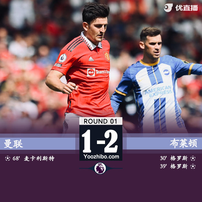 第39分钟,布莱顿反击,格罗斯策动交给拉拉纳,拉拉纳中路分给马什,后者低射被德赫亚扑出,格罗斯后点无人盯防的情况打门得手梅开二度,曼联0-2布莱顿。