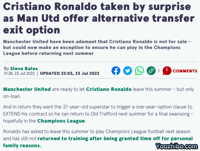去年夏天,C罗回归曼联签下了一份“2+1”的合同。曼联高层希望C罗能先激活这个续约1年的条款,将双方的合同延长至2024年。这样的话,曼联就会同意让C罗在今夏以租借的方式离队。下赛季结束后,C罗在明年夏天再回归曼联。