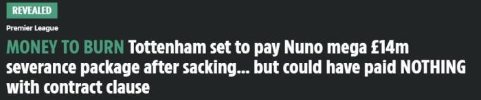 《太阳报》称,如果努诺本赛季没有将热刺带到联赛前6的位置,热刺就可以免费将其解雇。但显然列维已经失去耐心,他们选择向努诺支付1400万英镑将其在赛季中途解雇。