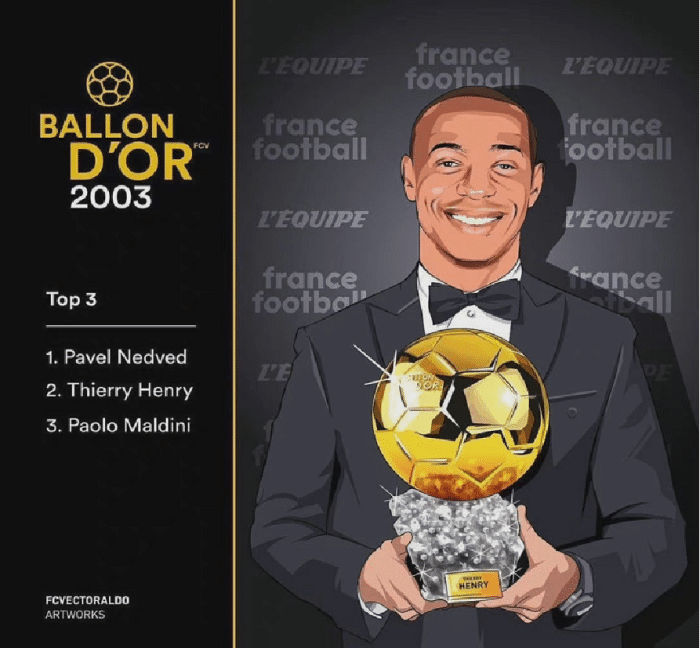03年金球奖的得主是内德维德,而那个赛季表现出色的亨利只拿到了第二名,要知道02-03赛季,亨利拿下了英超24球20助攻的数据,但是可惜的是那个赛季,阿森纳无缘英超冠军,最终导致亨利错失金球奖,不过老实说,如果只看球员的表现,个人感觉亨利比内德维德更强,他无缘金球奖真的可惜。