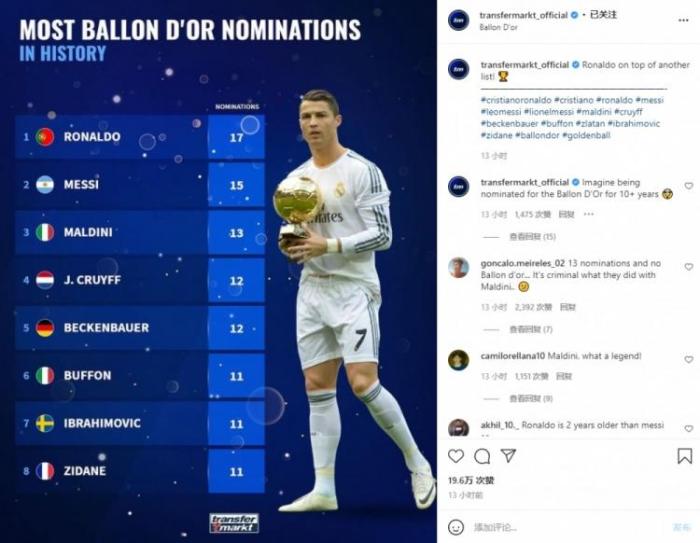 来源:JRS低调看直播10-31 11:11JRS低调看直播10月31日讯 金球奖不久后就要揭晓,今日,德转盘点了足球史上金球奖提名次数最多的球员,其中C罗17次位居第一,梅西第二。