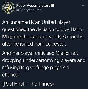 《泰晤士报》表示,在曼联2-4不敌莱斯特城的比赛后,一位曼联球员质疑索尔斯克亚让马奎尔在加盟仅6个月后就担任球队队长的决定。