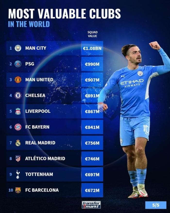 JRS低调看直播10月26日讯 今日,德转更新了世界足坛各俱乐部身价,曼城以10.8亿欧总身价继续占据榜首。曼联排名第三。