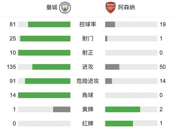 曼城5-0阿森纳 费兰-托雷斯两射一传热苏斯传射扎卡直红