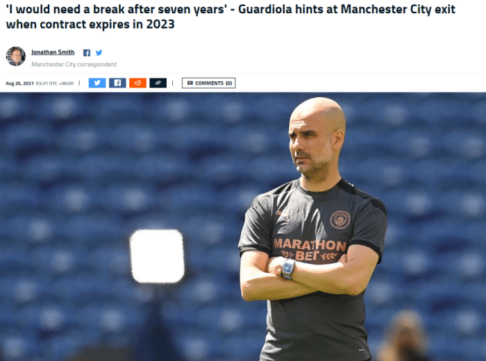 瓜帅说道:“下一步会是执教国家队,这是一个可能性。在曼城执教了七年之后,我需要休息一下,停下来看一看周围,从其他教练身上学习,我可能会走上这条道路。”
