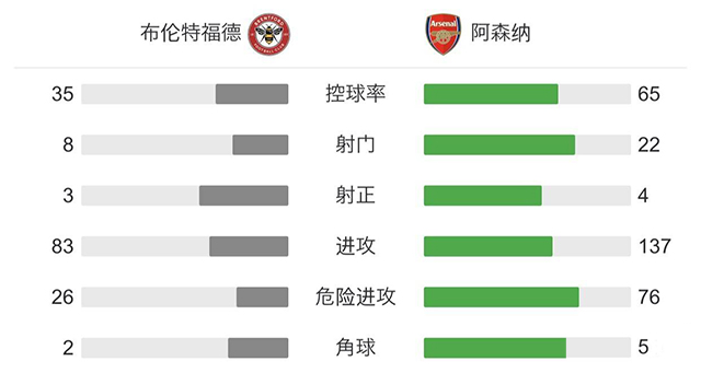 全场比赛结束,阿森纳客场0-2不敌布伦特福德。
