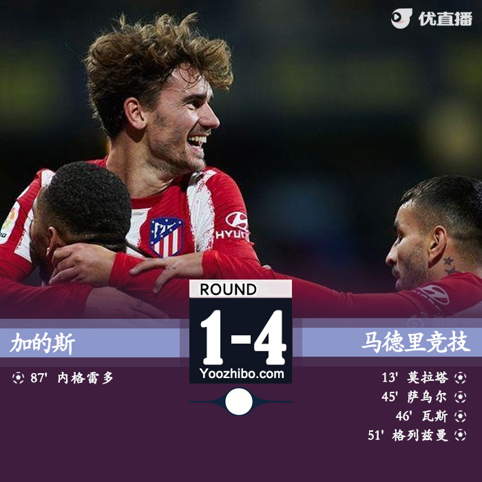 JRS低调看直播讯 北京时间2022年8月5日03:00,2022/2023赛季热身赛进行了一场较量,加的斯坐镇主场迎战马德里竞技。上半场,马德里竞技率先打破僵局,凭借莫拉塔和萨乌尔的进球,2:0领先。下半场,马德里竞技率先发难,沃斯和格列兹曼取得进球扩大优势;随后,内格雷多也取得进球加的斯缩小差距。最终,马德里竞技4:1获胜。