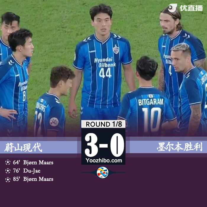 JRS低调看直播讯:北京时间12月6日22:00,亚冠1/8决赛,蔚山现代对阵墨尔本胜利。上半场,金仁成错失单刀,墨尔本胜利门将克罗康比屡献神扑;下半场,替补登场的约翰森双响,尹比加兰助攻元斗载破门。最终,蔚山现代3-0击败墨尔本胜利,晋级本赛季亚冠八强。